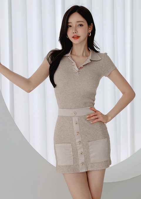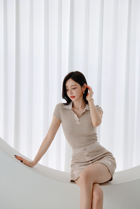 米色针织套装,短袖翻领衬优雅气质,高腰短裙勾勒曲线,浅色高跟鞋延伸修长双腿。简约穿搭中,知性魅力悄然绽放,如清风般温柔动人。